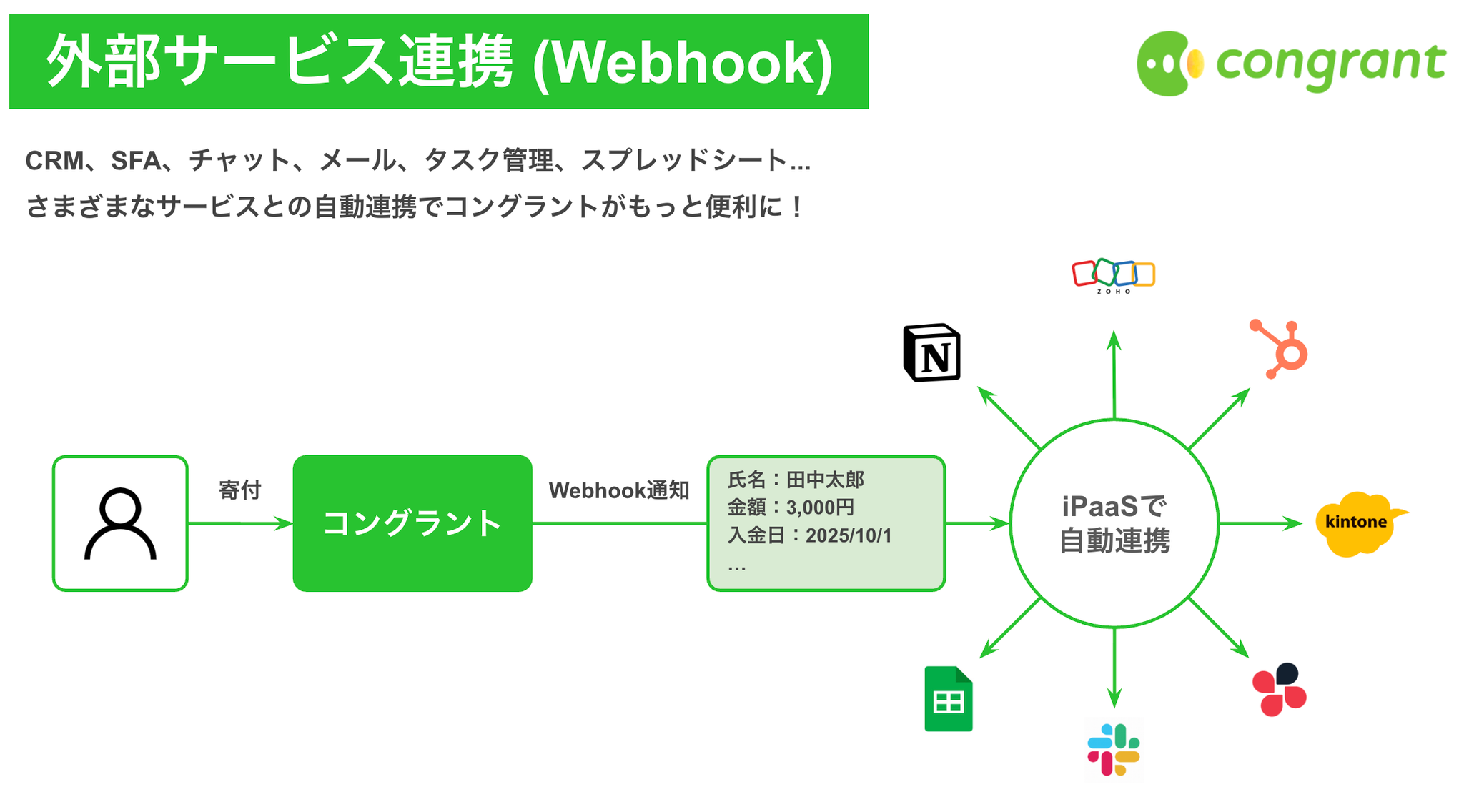 コングラントのWebhook単体では外部サービスとの自動連携はできません。Webhook通知の内容をもとに各種サービスに合わせて連携処理が行われる仕組みを構築する必要があります。