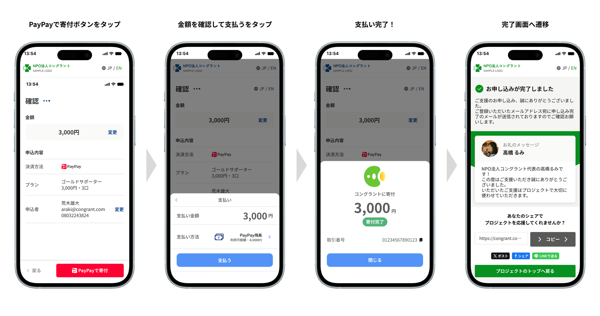 ※決済完了時に「コングラントに寄付」と表示されますが、これはPayPay側の仕様によるものです。決済完了後の画面にて、実際にご寄付いただいた団体名をご確認いただけますので、ご安心ください。