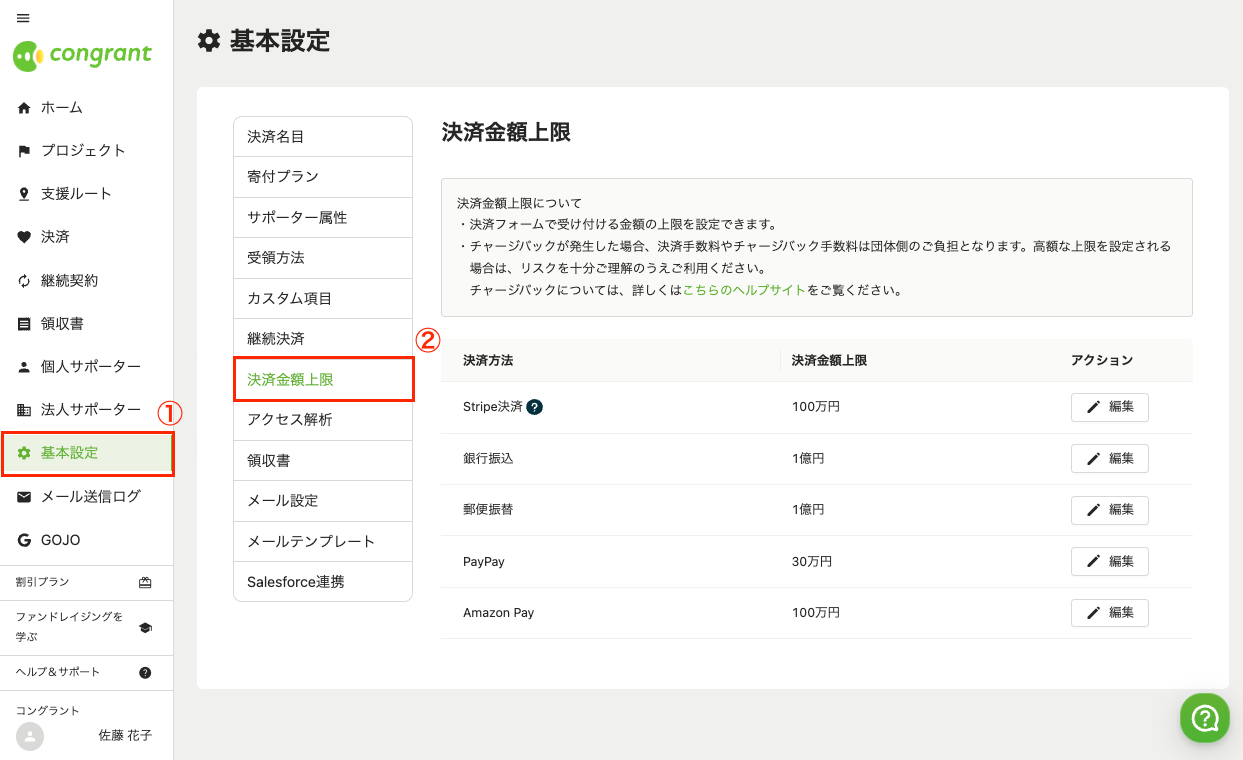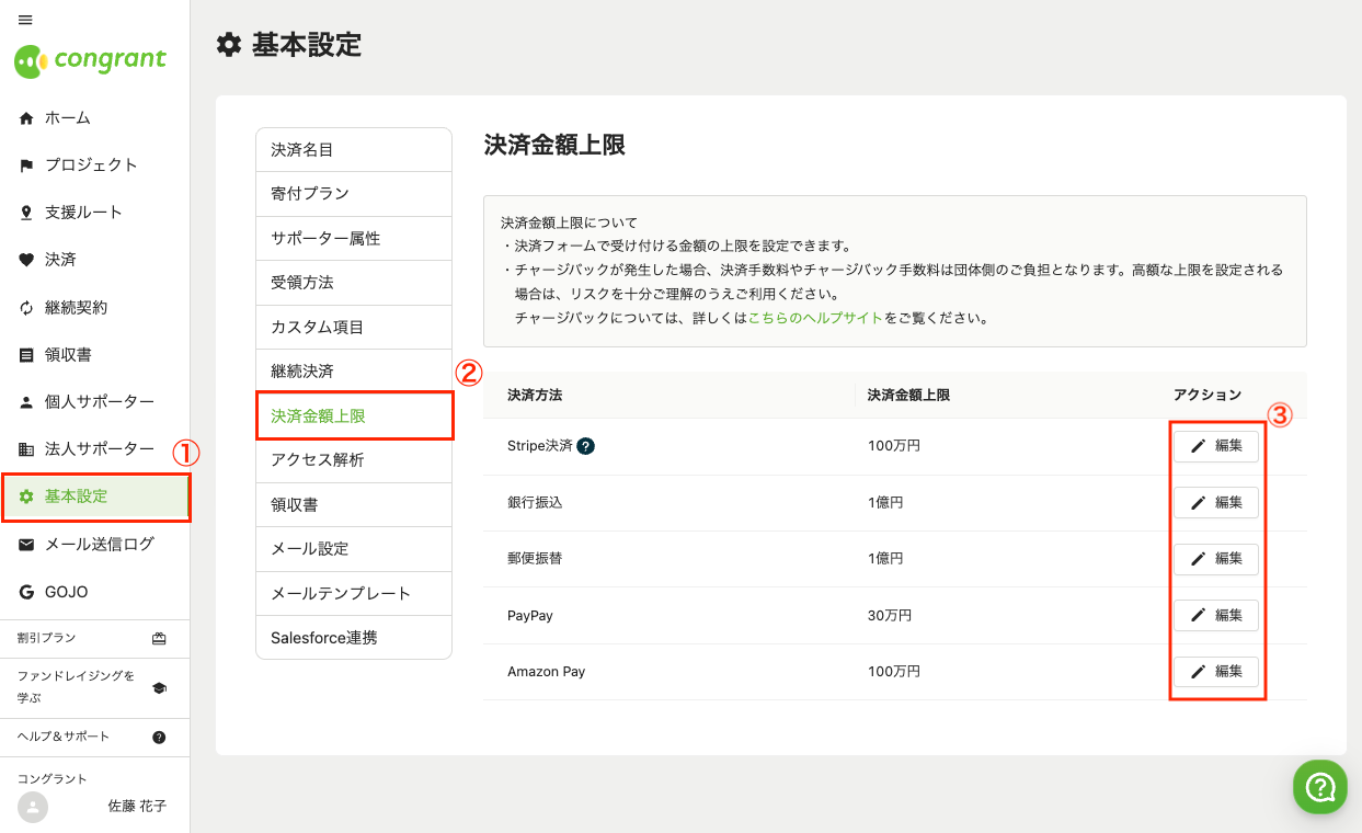 決済金額上限では、決済フォームで受け付けられる決済の上限金額の設定を変更することができます。一定金額以上の寄付を受け付けたくない場合や、初期設定より高い上限金額で寄付を受け付けたい場合にご活用ください。