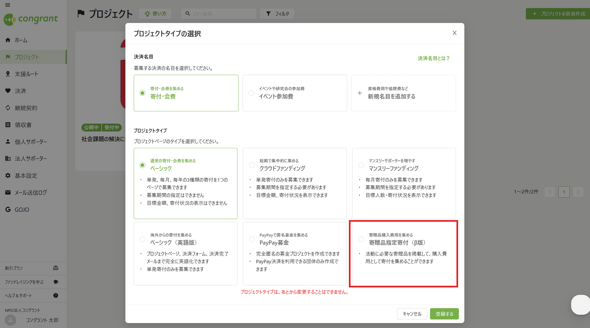寄贈品の購入費用を集めるプロジェクトタイプ「寄贈品指定寄付」を作成できるようになりました。
