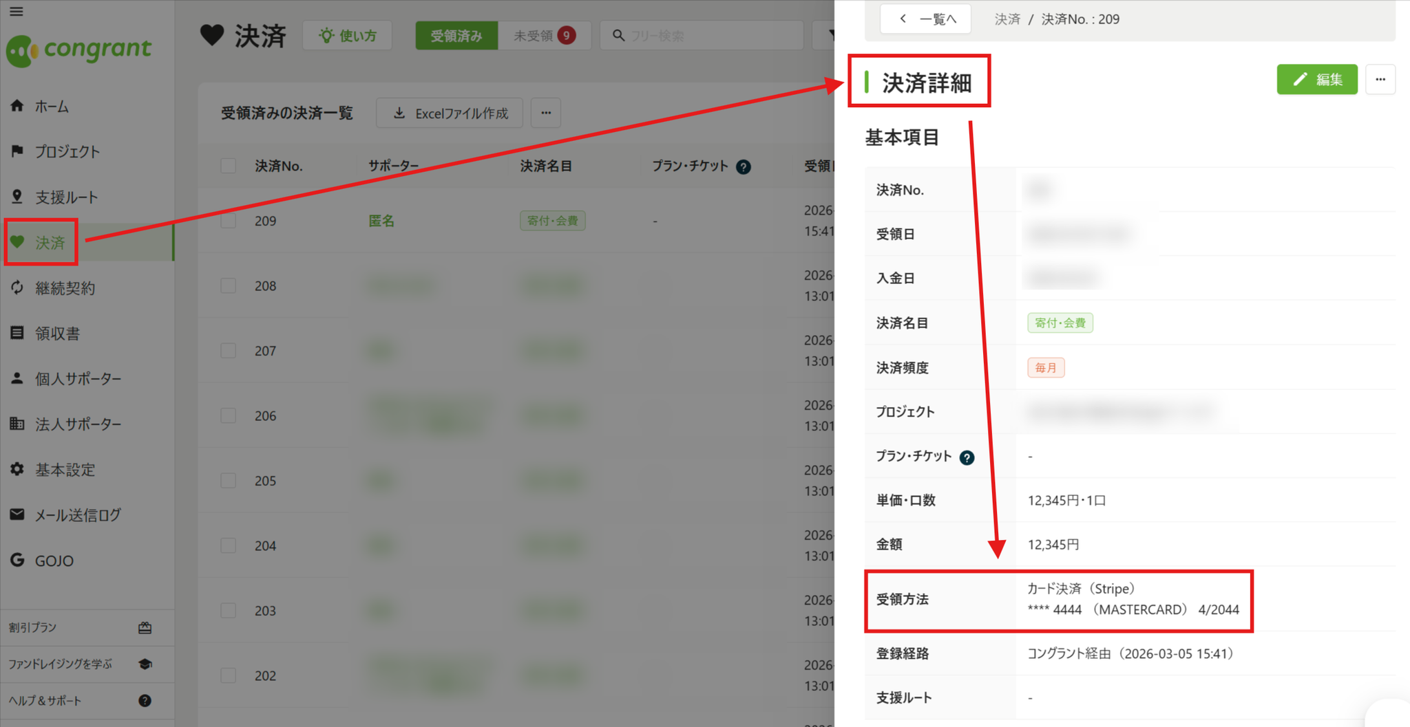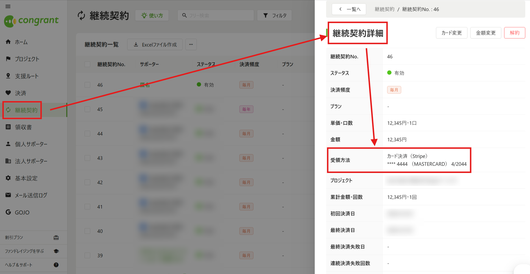 - 継続契約 > Stripe決済のレコードを選択 > 継続契約詳細の「受領方法」を確認