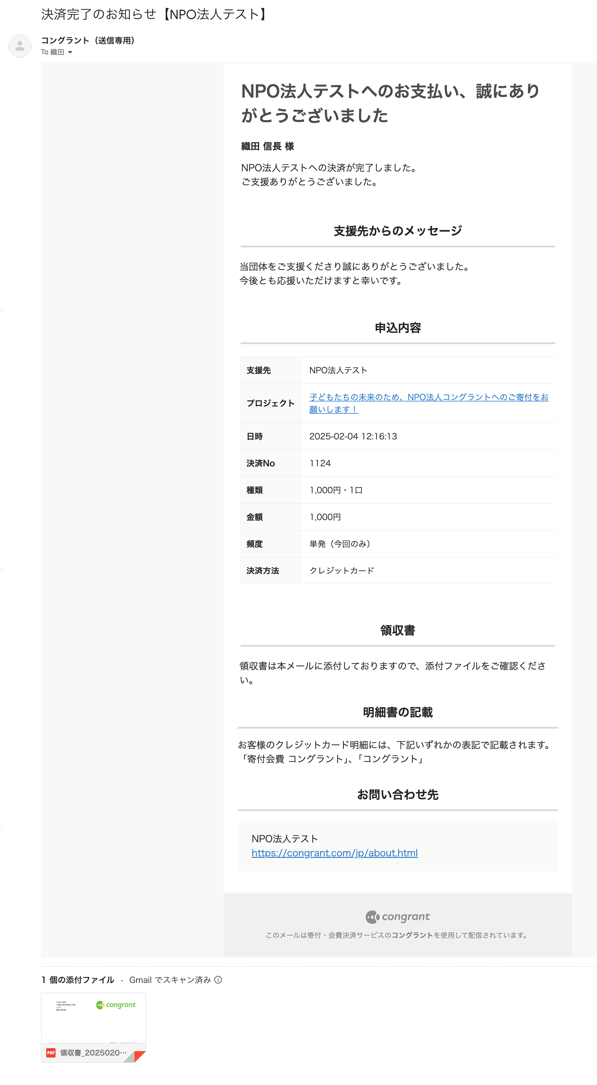 NPO法人コングラントへのお支払い、誠にありがとうございました