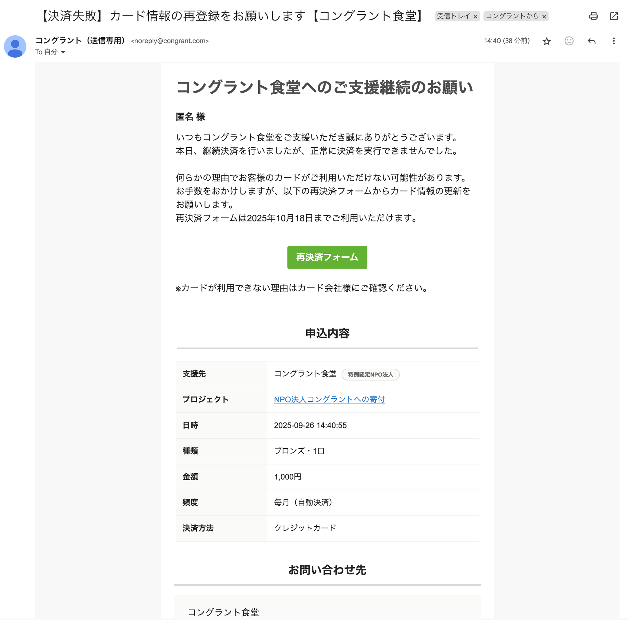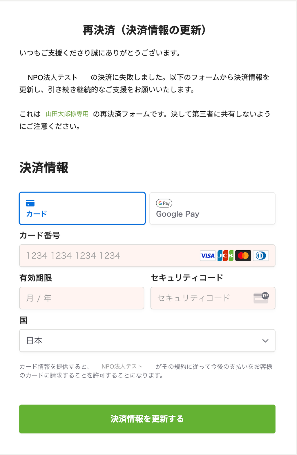 何らかの理由でお客様のカードがご利用いただけない可能性があります。お手数をおかけしますが、以下の再決済フォームからカード情報の更新をお願いします。