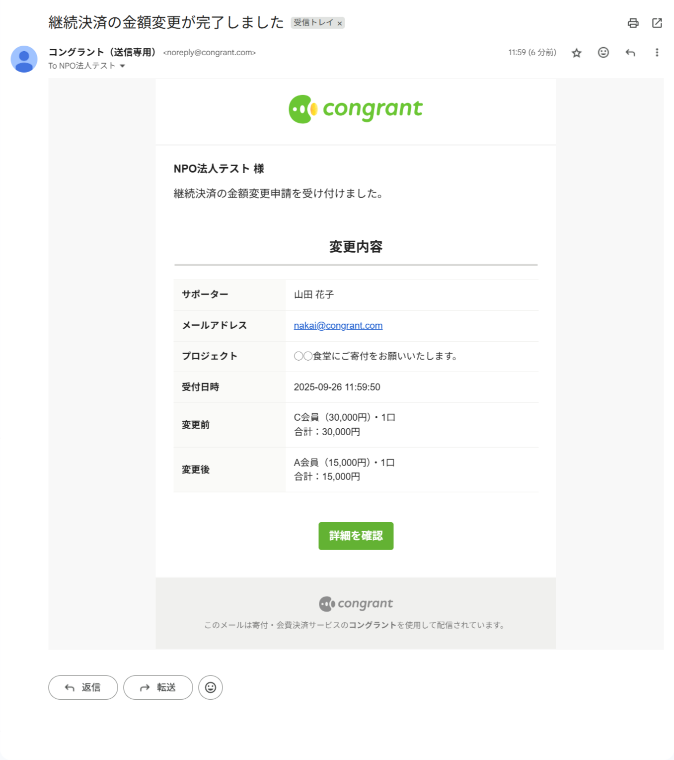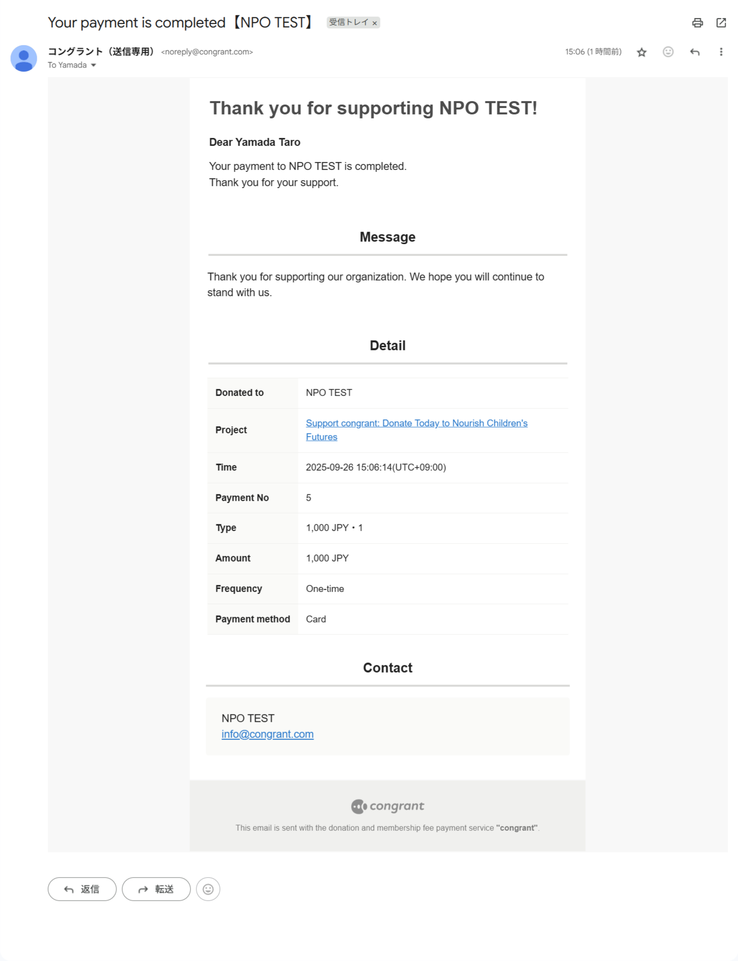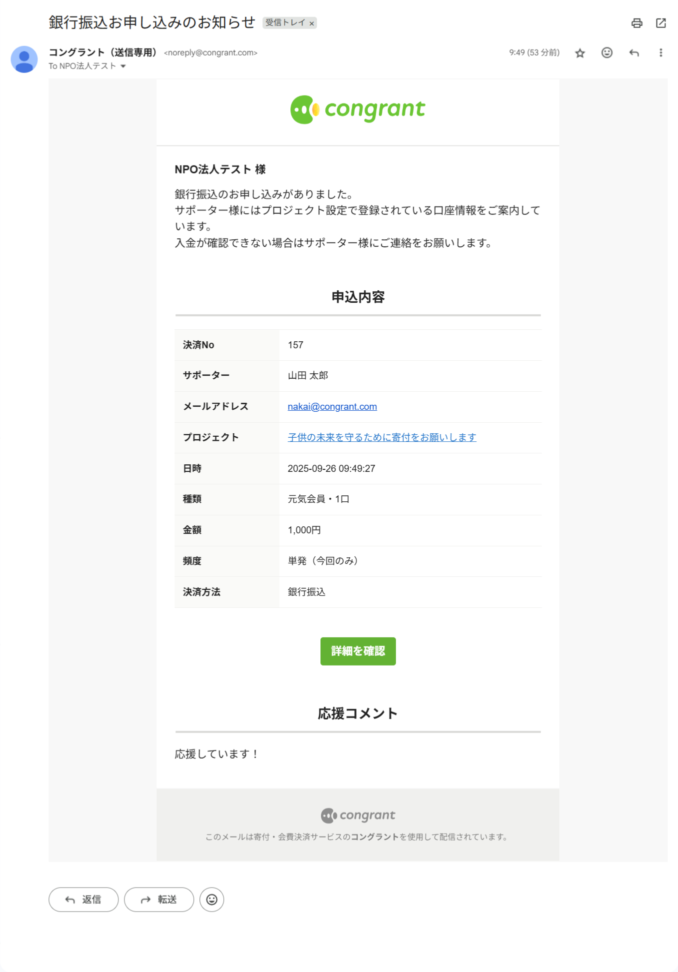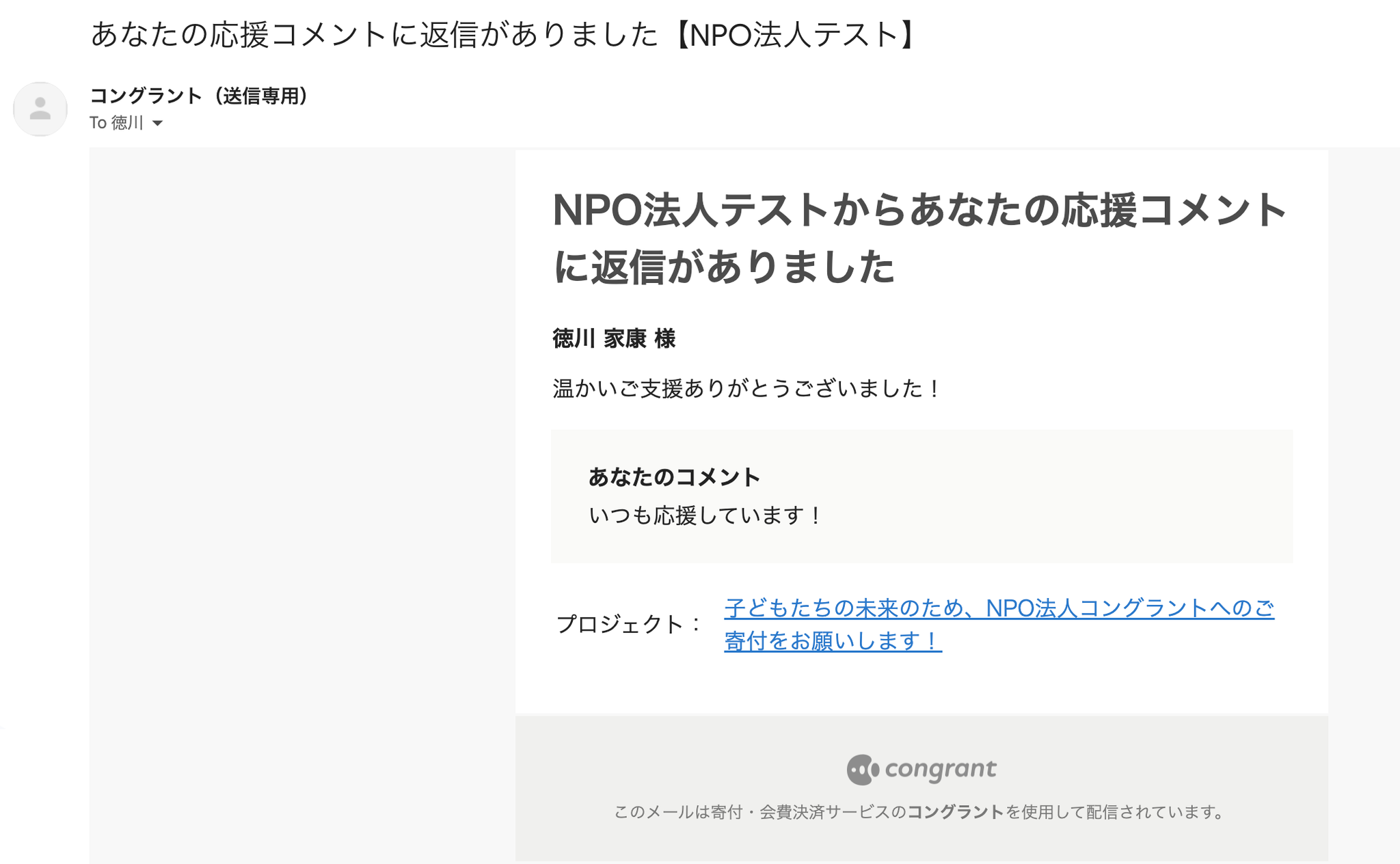 決済完了後のメールやサポーター宛のメッセージ、活動報告の更新通知など、コングラントからサポーター宛に送信されるすべてのメールに適用されます。