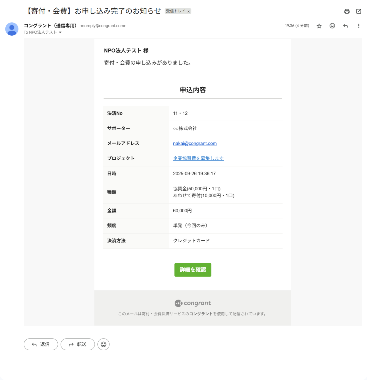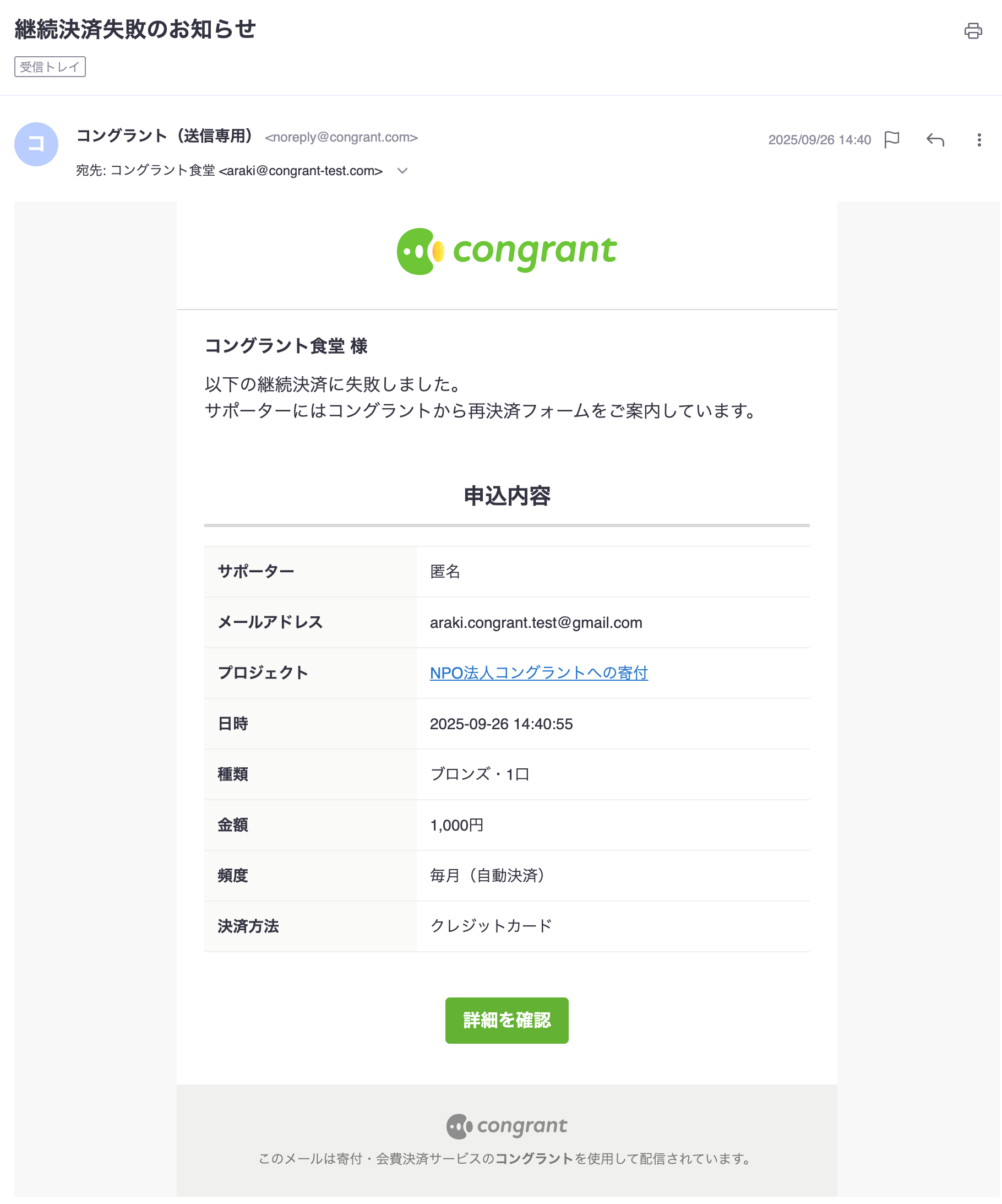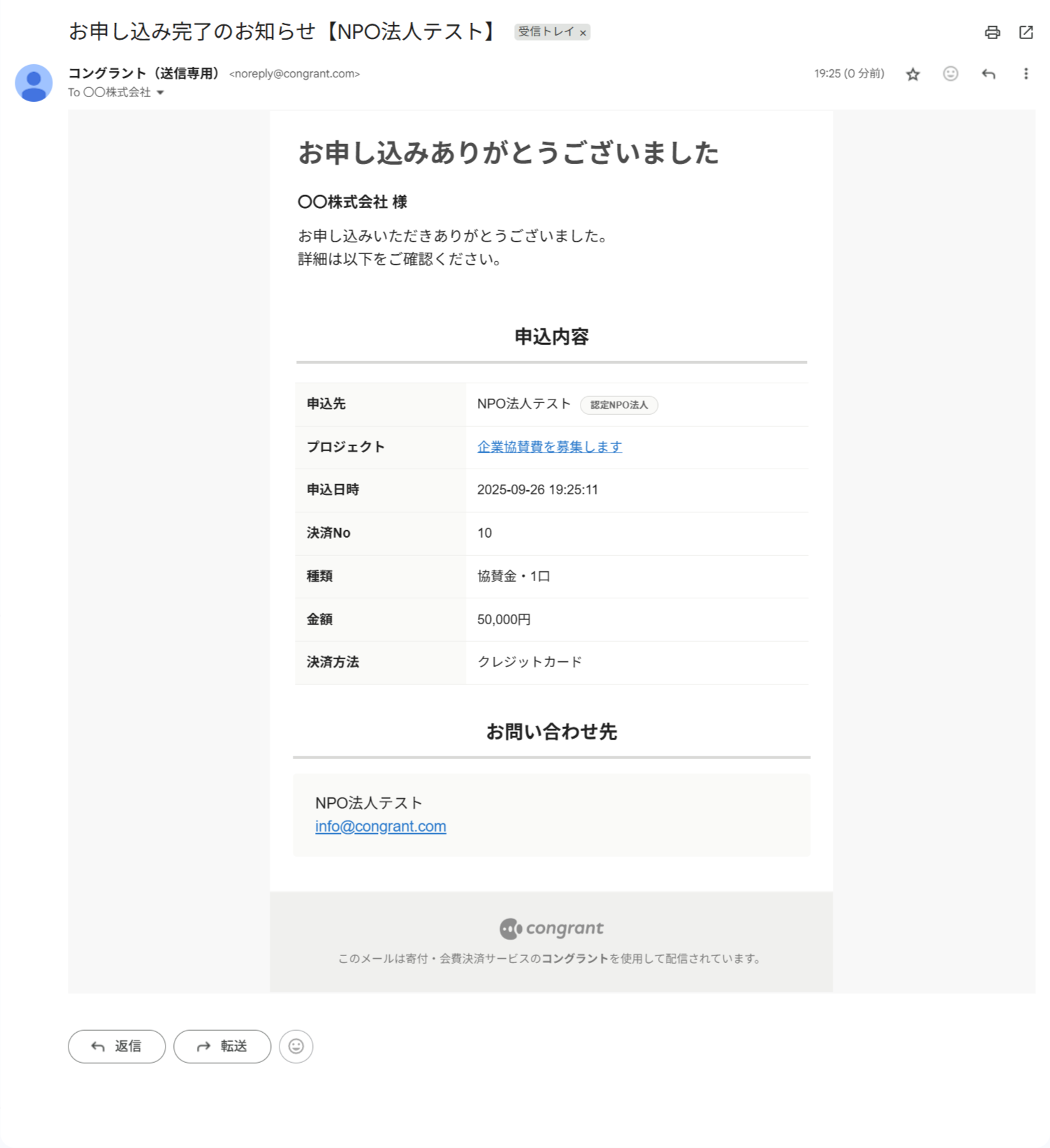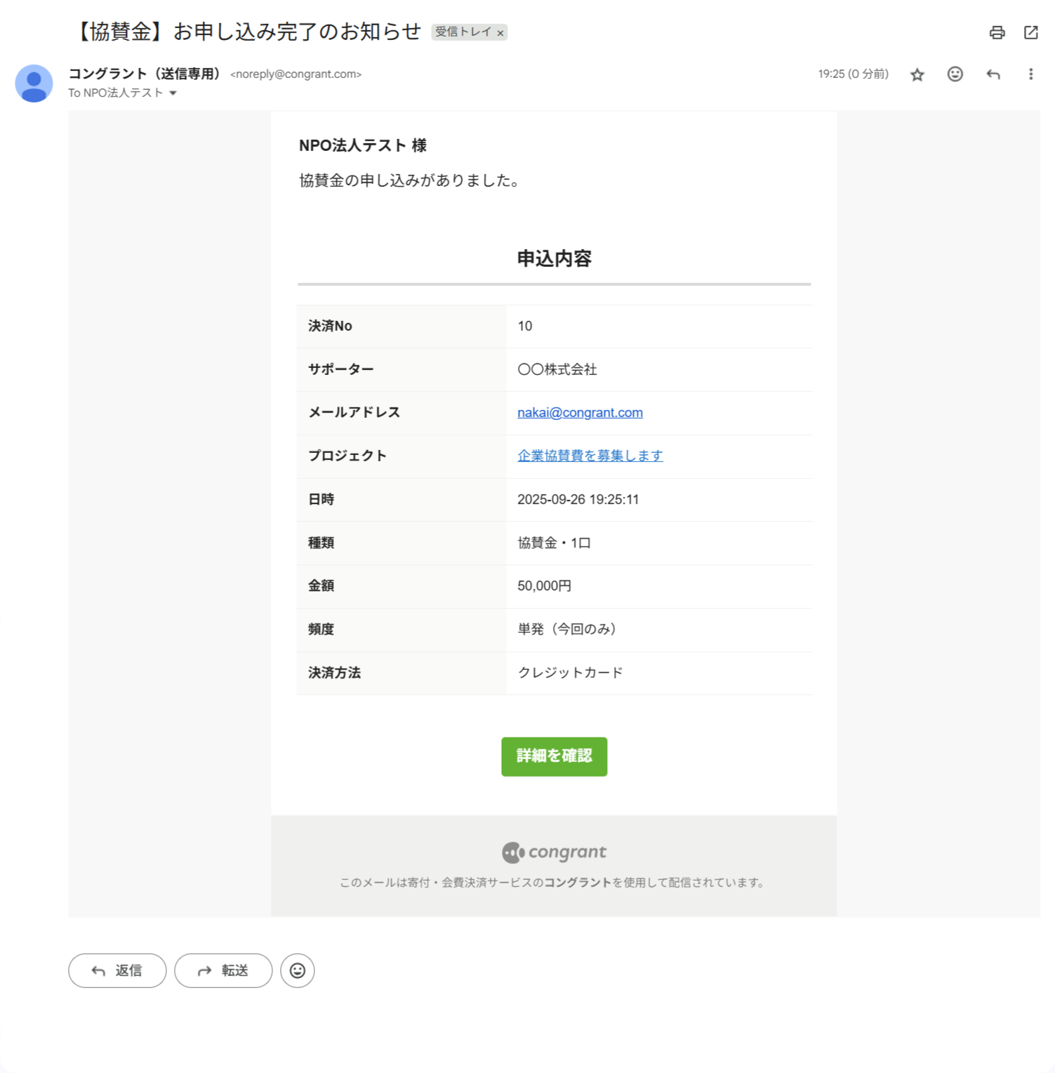 決済完了後のメールやサポーター宛のメッセージ、活動報告の更新通知など、コングラントからサポーター宛に送信されるすべてのメールに適用されます。