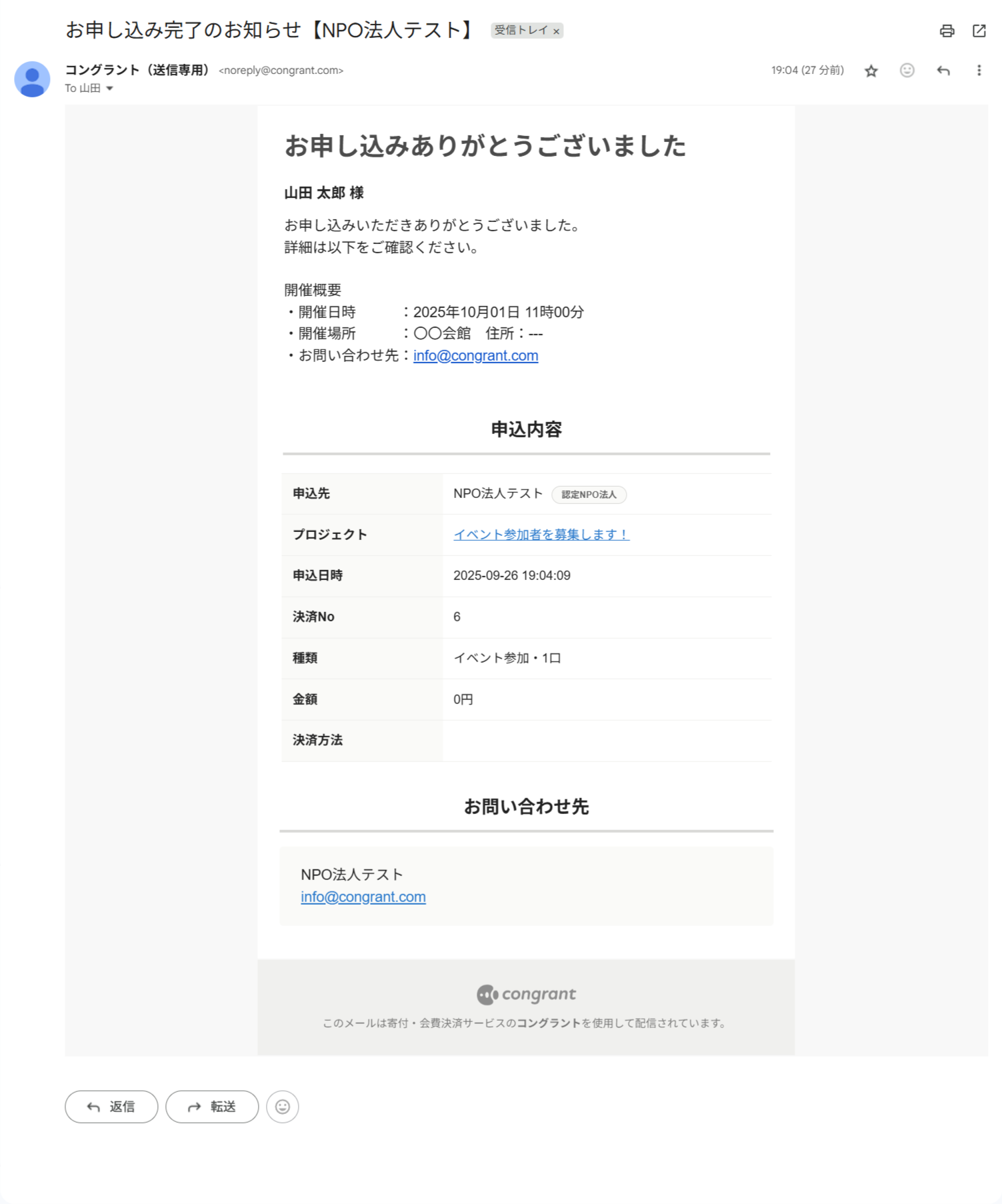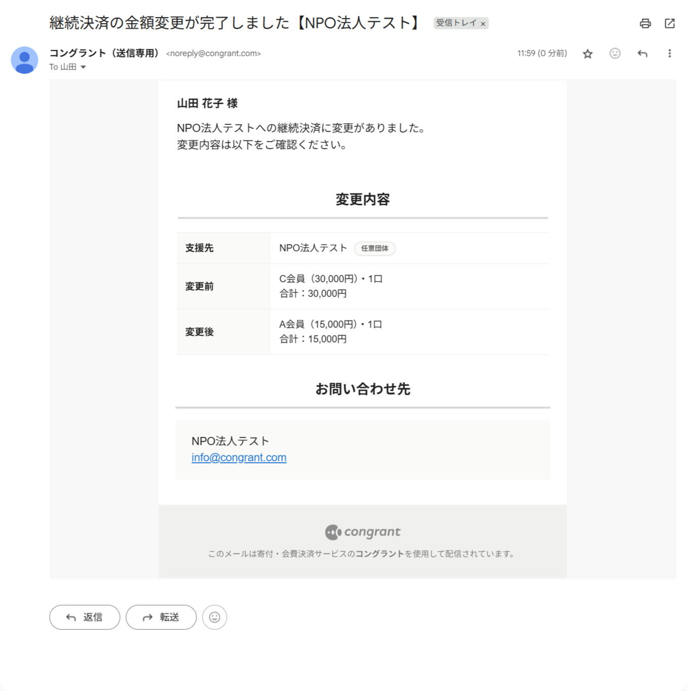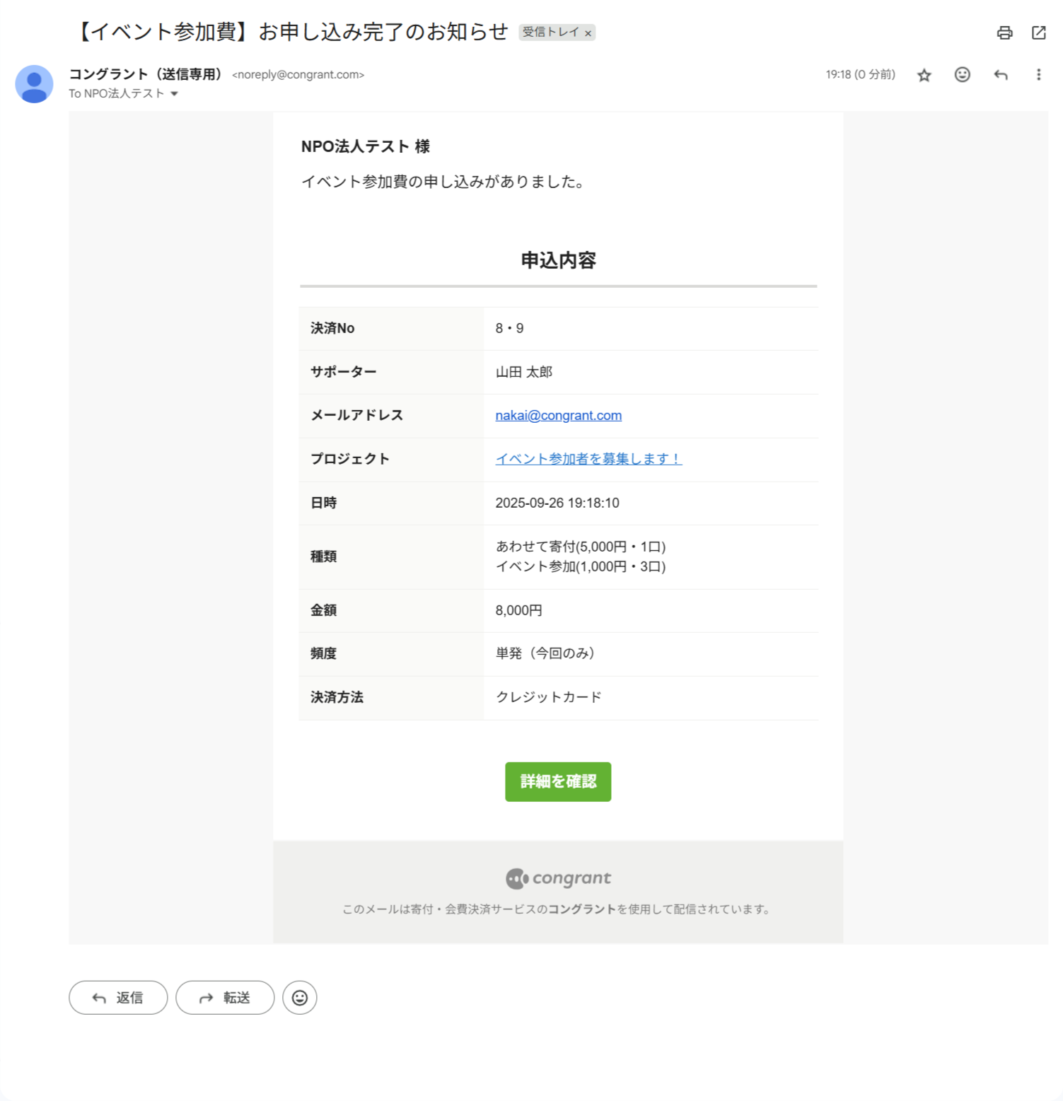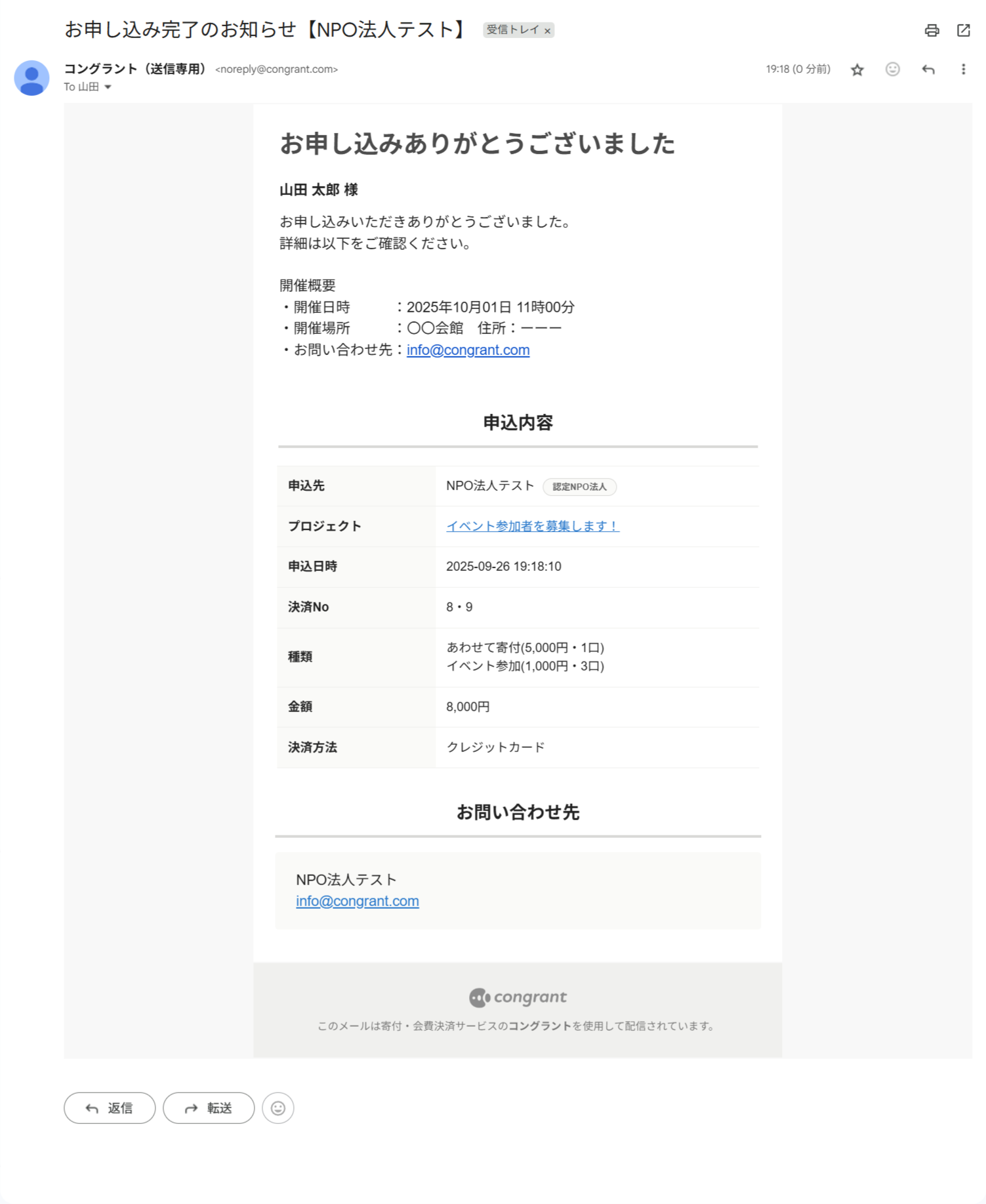 決済完了後のメールやサポーター宛のメッセージ、活動報告の更新通知など、コングラントからサポーター宛に送信されるすべてのメールに適用されます。