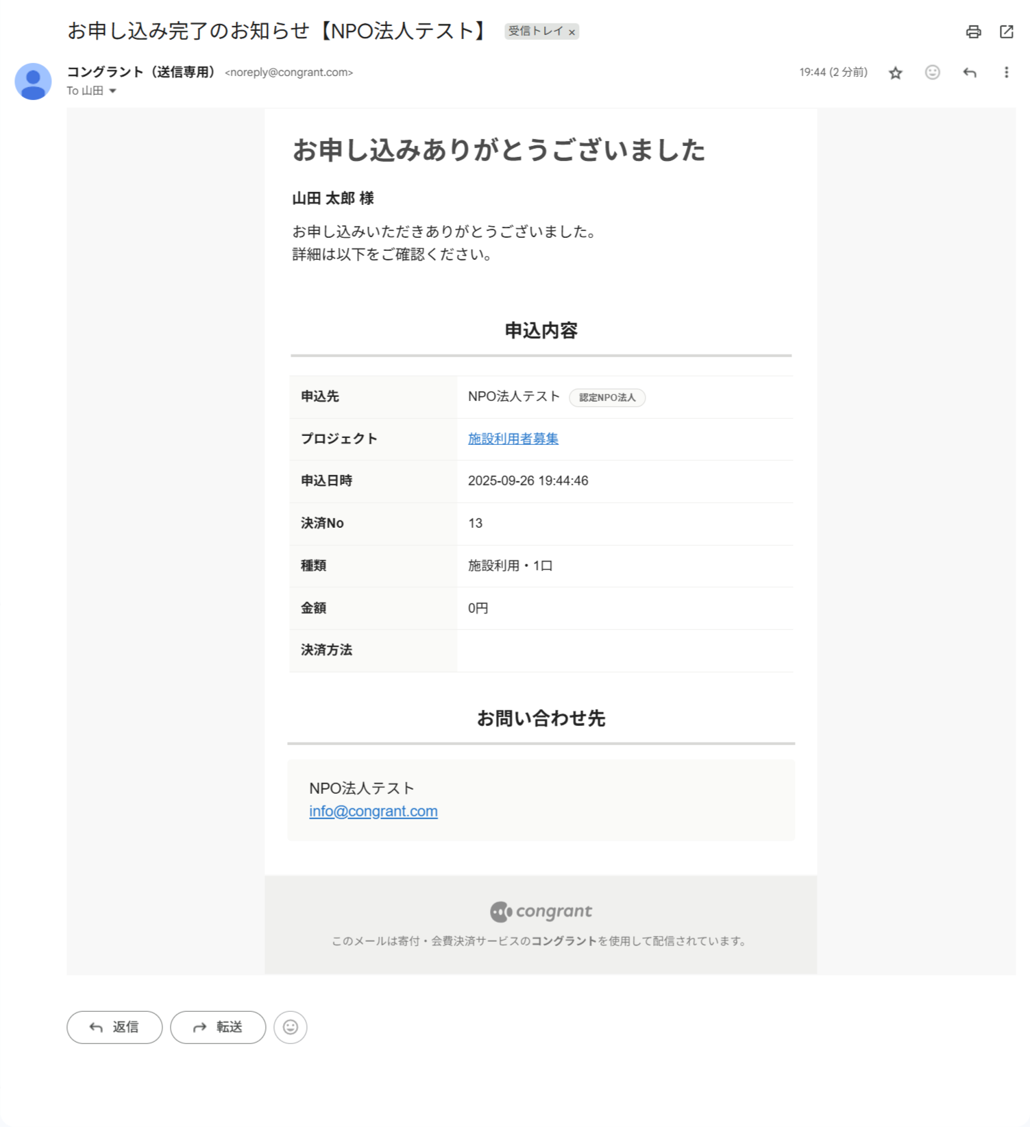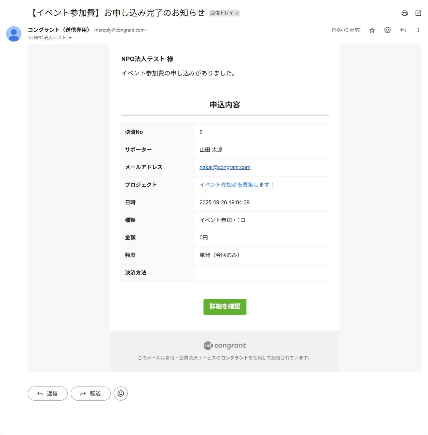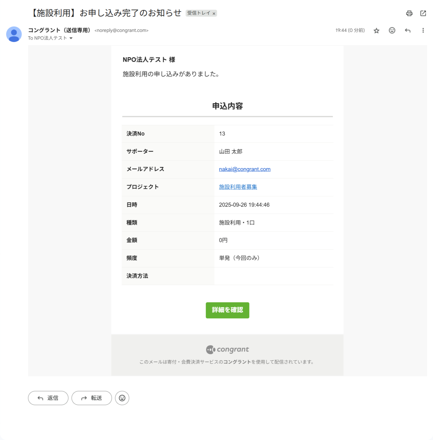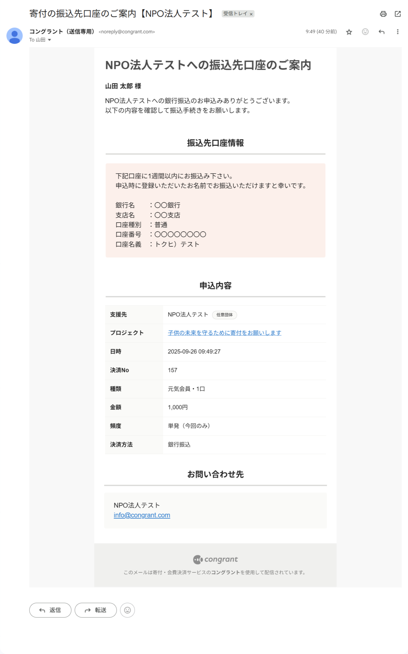 決済完了後のメールやサポーター宛のメッセージ、活動報告の更新通知など、コングラントからサポーター宛に送信されるすべてのメールに適用されます。